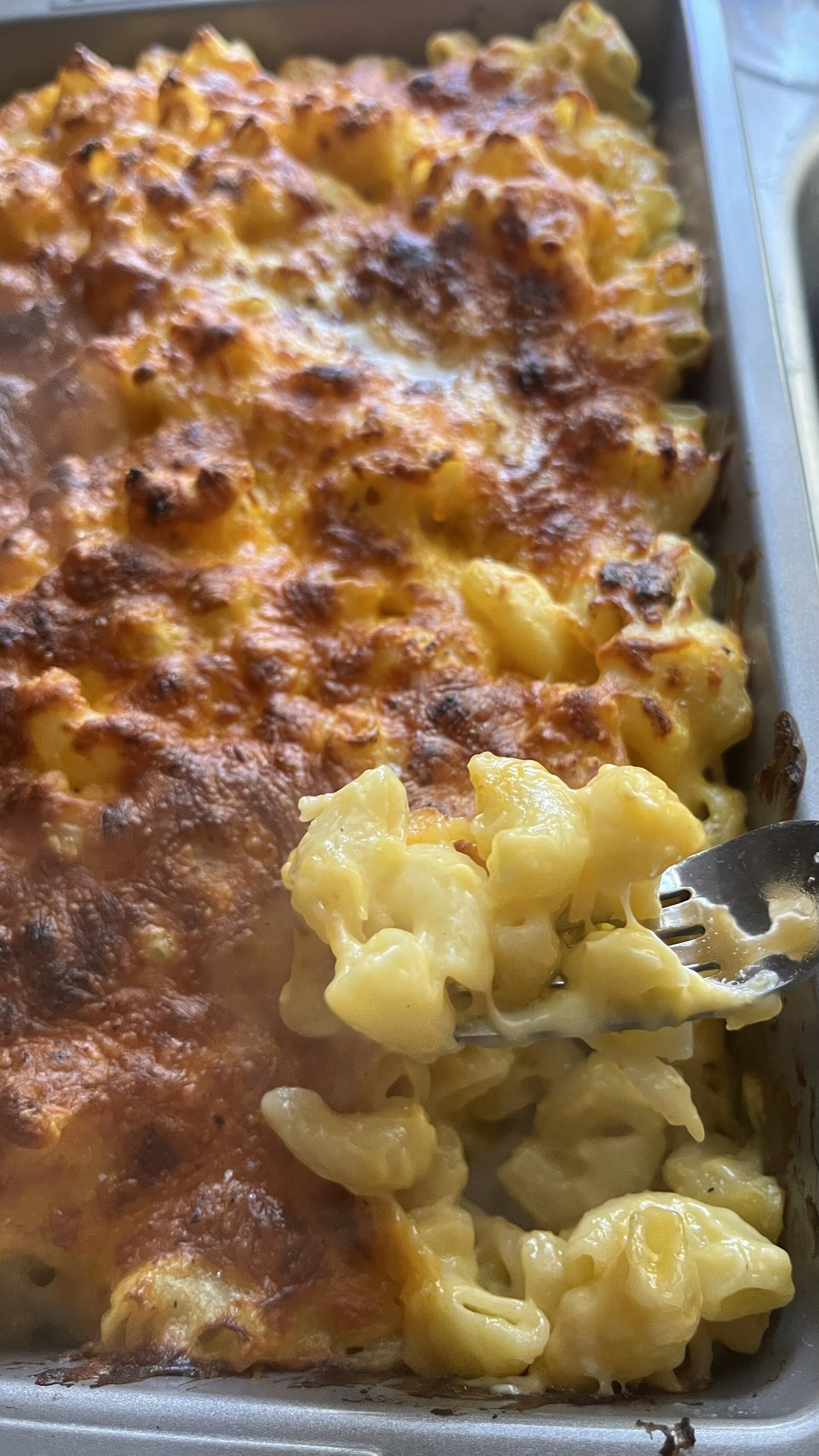 Our cheesy baked mac and cheese is the ultimate comfort food, baked to perfection with a golden, bubbly crust. Big mama always said, "The cheesier, the better!"
